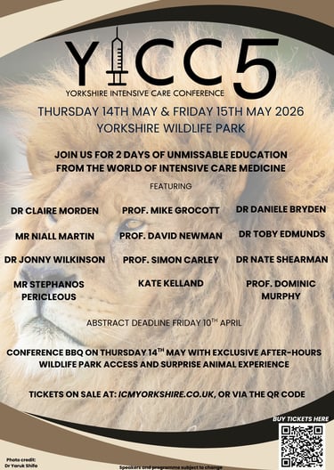 Yorkshire Intensive Care Conference is annually at the Yorkshire Wildlife Park in May. This year is a special occasion to mark YICC's 5th birthday, To celebrate, it will be a 2 day event on May 14-15th, 2026. It is a super day of interesting sessions from national experts.